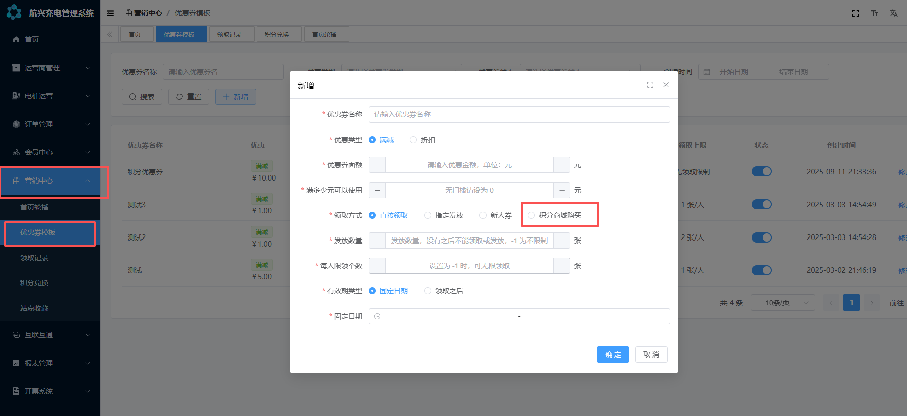 在营销中心的优惠券模板页面,您可以创建和管理不同类型的优惠券。