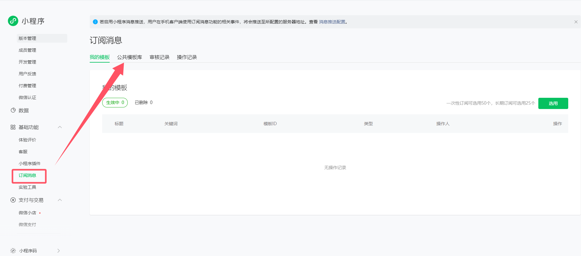 访问微信公众平台 (opens new window),使用小程序账号登录。配置消息发送模板